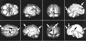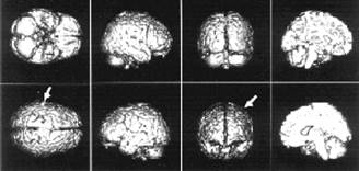 Интересные результаты даёт такой эксперимент. Испытуемому рассказывают одновременно две разные истории: в левое ухо одну, в правое — другую. На верхнем фото изображены разные проекции мозга — стрелками отмечены активизированные зоны, когда внимание сосредоточено на истории, рассказываемой в левое ухо. Внимание испытуемого „переключилось“ на „историю в правом ухе“ (нижнее фото). Можно заметить, что для фиксации внимания на „историю в правом ухе“ требуется гораздо меньшая активность мозга. Это связано с праворукостью большинства людей — обычно они берут телефонную трубку правой рукой и прикладывают её к правому уху. |