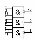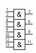 Назначения выводов 1,2,3,4,5,9,10,11,13 - входы 1 - 3 лог. элементов, 6,8,12 - выходы лог. элементов. К 14 - выводу подключается Uпит, а вывод 7 является общим.