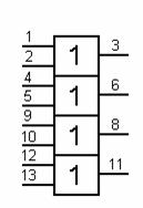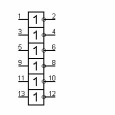 Назначения выводов 1,3,5,9,11,13 - входы 1 - 6 лог. элементов, 2,4,6,8,10,12 - выходы лог. элементов. К 14 - выводу подключается Uпит, а вывод 7 является общим.