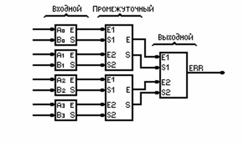 б) промежуточный блок - в этот блок поступают сигналы с входного блока, которые подвергаются сравнению и анализу, с выходов блока формируются сигналы, необходимые для формирования сигнала сообщающего о ошибке;