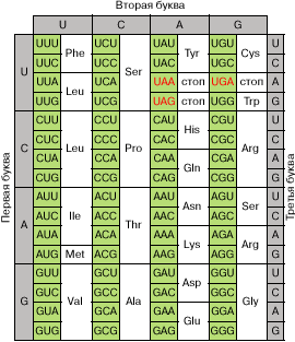 Рис. 2. Кодовый словарь. Красным цветом отмечены терминирующие кодоны