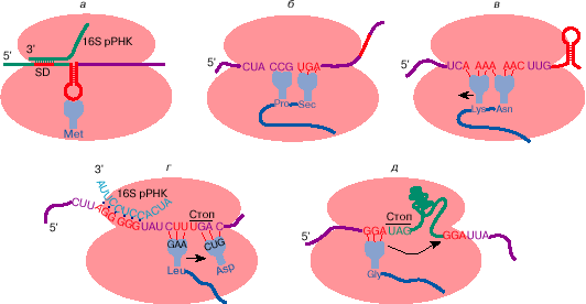 Рис. 3. Некоторые примеры отступления от общих правил трансляции генетической информации: узнавание инициирующего кодона на мРНК бактерий (а); прочитывание терминирующего кодона UGA как кодона аминокислоты селеноцистеина (б ); сдвиг рамки считывания на -1 при трансляции ретровирусной РНК (в); сдвиг рамки считывания на +1 при трансляции мРНК бактериального фактора терминации трансляции RF-2 (г); прыжок рибосомы на 50 нуклеотидов при трансляции мРНК гена 60 бактериофага Т4 (д). Рекодирующие сигналы на мРНК обозначены красным цветом. Дальнейшие пояснения см. в тексте