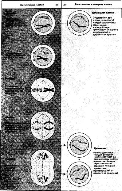 Рис. 5. Митоз обеспечивает постоянство хромосомного состава клетки. Одна пара гомологичных хромосом (обозначена белым) происходит от одного из родителей, другая (окрашена) - от второго родителя. Диплоидная клетка имеет по две копии каждой хромосомы (общее число 2п). Перед митозом хромосомы удваиваются, и профаза, следовательно, начинается с состояния 4п. Два члена каждой пары разделяются на две отдельные хромосомы, которые затем расходятся в разные дочерние клетки. При этом восстанавливается диплоидное число 2п, так что дочерние клетки имеют тот же набор хромосом, что и родительская клетка.
