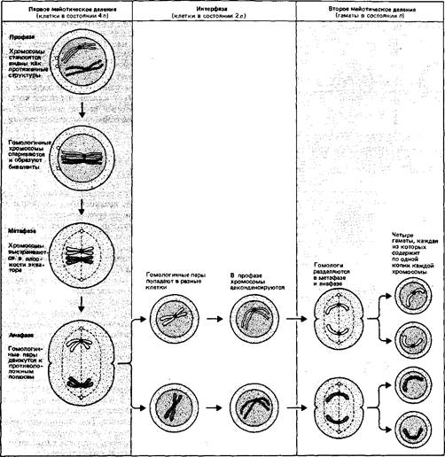 Рис. 6. В мейозе число хромосом уменьшается вдвое. На рисунке показано поведение одной пары гомологичных хромосом. Оба члена пары были удвоены перед началом профазы. Во время первого деления происходит спаривание гомологичных хромосом, а затем каждая пара расходится в разные клетки. Во время второго деления дуплицированные члены каждой пары расходятся в разные клетки, так что каждая гамета получает по одной копии. В клетке обычно находится несколько пар гомологичных хромосом, и члены каждой пары комбинируются между собой независимо друг от друга. Таким образом, подбор гомологичных хромосом (материнской и отцовской) в каждой гамете происходит случайно.