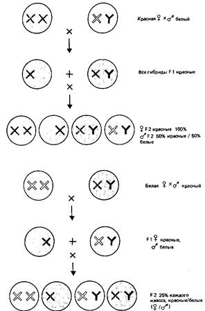 Мутацию white удалось локализовать в определенной хромосоме потому, что она оказалась связанной с полом. Обычно гомологичные пары хромосом при расхождении в мейозе образуют идентичные гаплоидные наборы. Однако у многих организмов, размножающихся половым путем, существует одно исключение из этого общего правила: самцы и самки могут иметь видимые различия в хромосомных наборах. Чаще всего у одного из полов одна хромосомная пара состоит из разных хромосом.