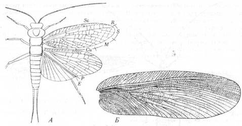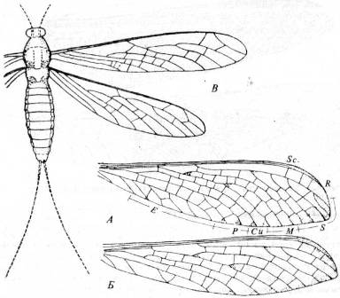 Рис. 5. Отряд Megasecoptera. Переднее (А) и заднее (Б) крылья Aspidothorax triangularis из позднего карбона Европы. (По Carpenter.) В. Pseudohymen angustipenni: из нижнепермских отложений Урала. (Из Родендорфа и др.)