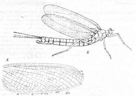Находки ископаемых насекомых, принадлежащих четырем вымершим и двум современным отрядам Paleoptera, свидетельствуют о том, что два выживших отряда - Ephemeroptera (поденки; рис. 13, А и Б) и Odonata (стрекозы) - это всего лишь остатки древней и очень разнообразной фауны крылатых насекомых Пенсильвания. Современные отряды представляют собой две разошедшиеся ветви Paleoptera. У Ephemeroptera способность к полету как на преимагинальной, так и имагинальной стадии развития, а также редукция ротового аппарата у этих стадий, произошедшая в послепалеозойское время, говорят об их давнем отделении от других Paleoptera.