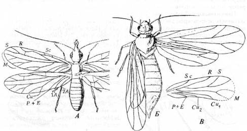 У раннепермских Psocoptera, относящихся к подотряду Permopsocida (рис. 16, А), обе пары крыльев были почти одинаковыми, с простым жилкованием. К концу пермского периода по меньшей мере у двух семейств отряда Psocoptera уже были редуцированные задние крылья и видоизменено жилкование передних крыльев (рис. 16, Б); эти формы были удивительно похожи на современных сеноедов. Ископаемых Thysanoptera немного, наиболее известны находки из юрских отложений Средней Азии. Известны также находки насекомых, похожих на трипсов, из верхнепермских отложений в Европейской части.