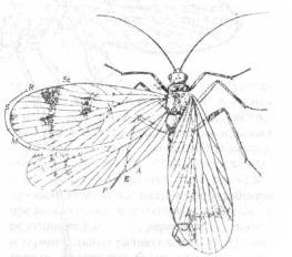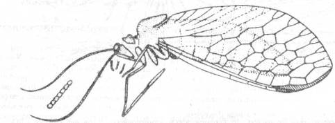 Примитивные нейроптероиды. Из примитивных нейроптероидов отряды Megaloptera (большекрылые), Neuroptera (сетчатокрылые) (рис. 16), Glosselytrodea и Coleoptera (жуки) появились в пермском периоде. Появление Raphidioptera (верблюдки) (рис. 17) можно с достоверностью отнести к юрскому периоду. Обилие и видовое разнообразие представителей этих отрядов были значительно больше в пермском, триасовом и юрском периодах, чем сейчас.