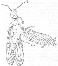 Рис. 18. Отряд Raphidioptera: Mesoraphidia pterostigmalis из юрских отложений Казахстана. (Из Родендорфа и др., по Handlirsch 1906-1908.)