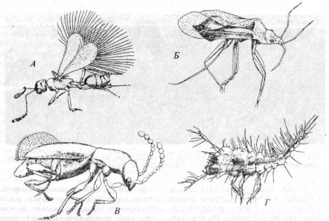 А.Хальцида (сем. Mymaridae, отр. Hymenoptera). Б. Мелкий хищный клоп (сем. Anthocoridae, отр. Hemiptera). В. Жук (сем. Scydmaenidae, отр. Coleoptera). Г. Личинка жука-хищника (сем. Staphylinidae).