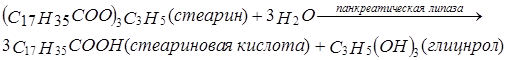 Переваривание жиров начинается в тонком отделе кишечника, где панкреатическая липаза с помощью желчных кислот и белка колипазы конвертирует жиры в глицерол и жирные кислоты. Одна молекула жира дает одну молекулу глицерола и три молекулы жирной кислоты: