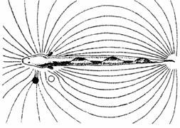 Рис.2. Электрическое поле Gymnarchus. Справа от животного оно не искажено; слева искажено хорошим проводником и плохим проводником. Животное может обнаружить эти два объекта, почувствовав их воздействие на электрическое поле.