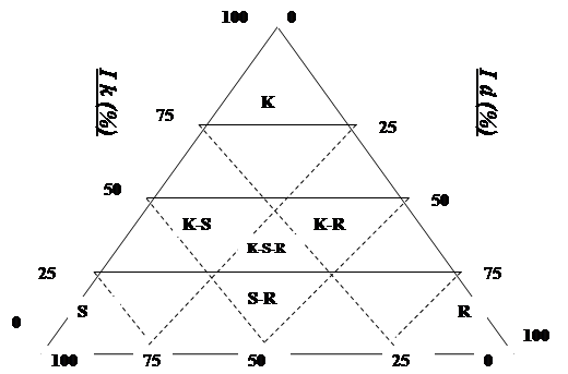 В углах своей схемы Грайм поместил три типа, названных первичными, и все поле треугольника разбил на четыре вторичных типа, представляющих переход между первичными типами:KS, RR, RS, KRS. ( 10 )