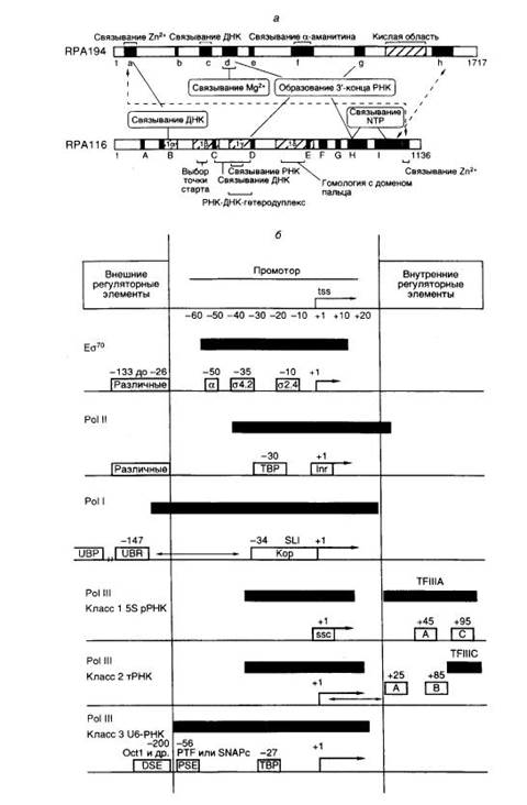 а – Полипептидные цепи двух больших субъединиц изображены в виде горизонтальных прямоугольников, в которых черным цветом и латинскими буквами отмечены участки, консервативные у большинства известных РНК-полимераз. Кислая область и участки Iα-Iδ характерны для РНК-полимераз I. Обозначены зоны полипептидных цепей, формирующие активный центр фермента и необходимые для выполнения соответствующих функций (например связывания Mg2+). Пунктирные стрелки указывают на участки субъединиц, контактирующие друг с другом. Незаштрихованными прямоугольниками обозначены известные структурные элементы промоторов, необходимые для инициации или активации транскрипции. Внутри прямоугольников приведены названия факторов транскрипции, взаимодействующих с соответствующими элементами промоторов, а также названия сайтов или взаимодействующих с ними белков, находящихся над сайтами. Стрелки ↔ обозначают фиксированные расстояния между элементами промоторов, а → – 5′-концевые части элонгируемых транскриптов. Черными прямоугольниками обозначены участки промоторов, защищаемые от действия ДНКазы I или других агентов Eσ70, а также эукариотическими транскрипционными комплексами, обеспечивающими базальный уровень транскрипции. tss – точка инициации транскрипции.