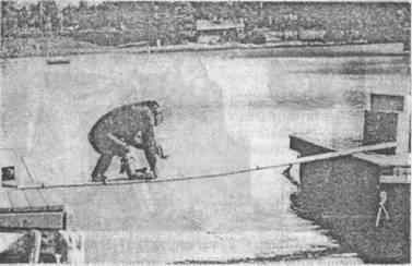 Между тем на самом деле оснований для столь безапелляционного вывода не было. В частности, при анализе фотографий современному наблюдателю бросается в глаза, что плоты (скорее платформы) были расположены достаточно высоко над водой, так что шимпанзе, который побаивается воды, мог предпочесть перебраться на соседний плот, чем рисковать оказаться в воде, пытаясь зачерпнуть ее с платформы (рис. 11).