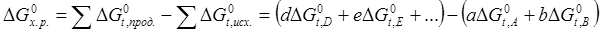 равно разности между суммой стандартных энергий Гиббса образования продуктов реакции и суммой стандартных энергий Гиббса образования исходных веществ: