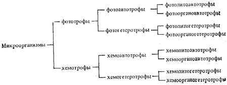 Таким образом, принимая во внимание тип питания (авто- или гетеротрофное), природу донора электронов источник энергии (свет или химическая реакция), возможные сочетания вариантов конструктивного и энергетического обменов можно представить в виде следующей схемы.