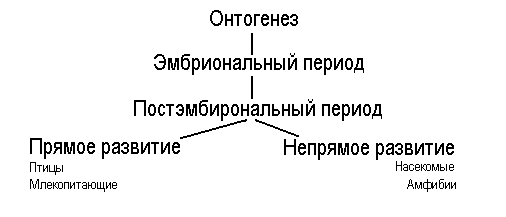 С момента образования зиготы начинается онтогенез (от греч. on (ontos) – сущее и genesis – рождение), или индивидуальное развитие организма, которое заканчивается смертью. В онтогенезе Многоклеточных животных выделяют два периода: эмбриональный и постэмбриональный.