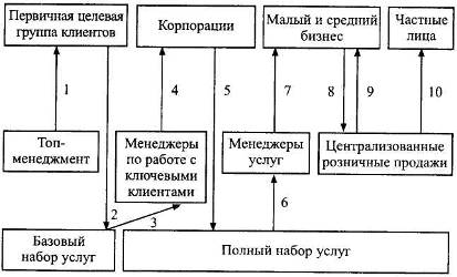 Постепенно мощности банка разрастаются. Для их поддержки, реализуя стратегию персонального менеджмента, банк привлекает новых ключевых менеджеров (key account managers), а те - новых крупных клиентов. По мере роста числа привлеченных клиентов растут требования к линейке услуг банка, которые могут обеспечить квалифицированные менеджеры по различным направлениям. Менеджеры занимаются привлечением клиентов, но только каждый на свой вид услуг. Только в этот момент банк всерьез начинает задумываться о согласовании действий по различным направлениям, то есть о наиболее эффективной стратегии продаж.