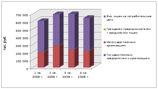 Объем краткосрочного кредитования составил 624 018 руб. на 1 квартал 2008 г. и 716 276 руб., 722 120 руб., 663 311 руб. на 2, 3,4 кварталы 2008 г. соответственно.