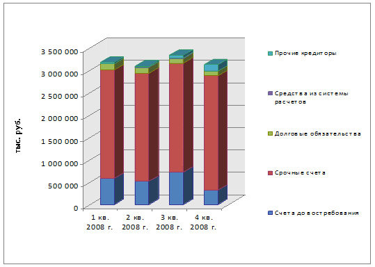 Следует отметить неоднородность динамики привлеченных межбанковских кредитов, если во втором и третьем квартале наблюдалось не изменность данного показателя, то в период с 01.10.08 г. по 01.01.09 г. прирост кредитов, полученных у других банков, составил 1727% или 259 000 тыс. руб. Удельный вес кредитов, полученных у других банков, в пассивах банка за исследуемый период увеличился с 0,5% до 8,8%.