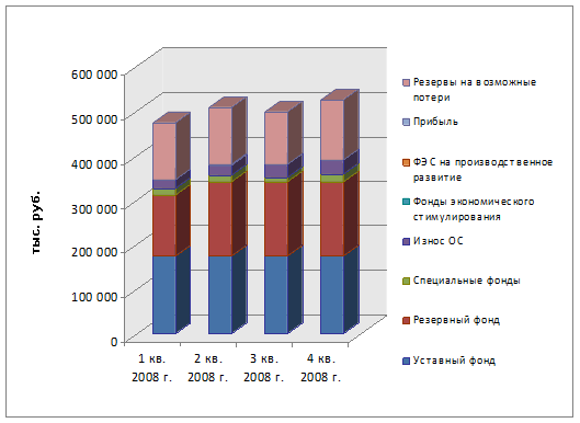 Собственные средства банка на 01.04.08 г. составили 1148274 тыс. руб., на 01.07.08 г. – 1548377 тыс. руб., на 01.10.08 г. – 1955232 тыс. руб., на 01.01.09 г. –2355953 тыс. руб.