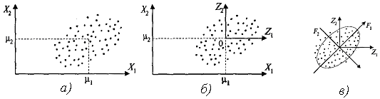 Производится центрирование исходных данных (рис.1а), начало координат переносится в центр распределения данных (центроид), являющимся центром эллипсоида рассеивания случайного вектора Х (рис.1б).