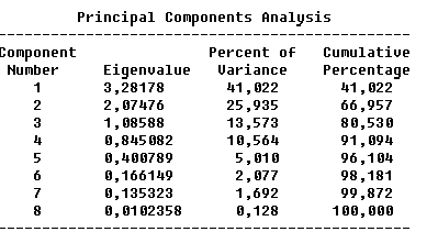 В Данной таблице содержится информация о результатах построения главных компонент: собственные значения главных компонент (eigenvalue), упорядоченных по величине, процент дисперсии (percent of variance), приходящейся на каждую выделенную главную компоненту, накопленный процент дисперсии (cumulative percentage).