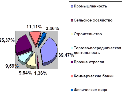 Основное направление кредитования является промышленность на которую приходится 39,47% соответственно, это показывает основную стратегию кредитной политики проводимой Сбербанком, на второе место можно поставить строительство, торгово-посредническую деятельность и коммерческие банки, на которые в совокупности приходится 30,33%. Меньше всего уделяется внимание сельскому хозяйству, так как в этой отрасли наиболее тяжелая ситуация и низкая возможность возврата кредита.