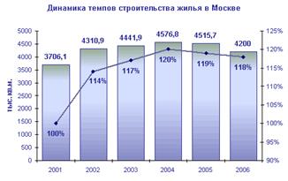 Наиболее серьезным препятствием для стремительного развития ипотечного рынка становятся медленное строительство и стремительный рост цен на жилье. По данным Федеральной службы государственной статистики, на одного жителя России в 2005 году приходилось по 20,8 кв. метров жилья. За последние три года эта величина фактически не изменилась, что свидетельствует об ограниченном предложении жилых площадей. В Москве же с 2004 года зафиксирована отрицательная динамика темпов строительства, что и вызвало очередной виток резкого роста цен на жилье (рис. 1).