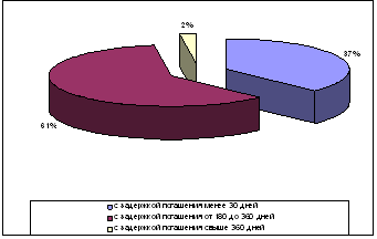 Данные диаграммы наглядно показывают, что наибольшая доля просроченной ссудной задолженности приходится на задолженность с задержкой погашения от 180 до 360 дней. 2% можно считать безнадежной задолженностью и 37 % приходится на задолженность со сроком погашения до 180 дней.