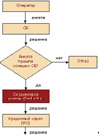 В первой, наиболее простой схеме, анкета последовательно проходит через все службы банка: служба безопасности, скоринговая модель, кредитный отдел, как показано на рисунке 14.