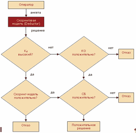 Такой вариант схемы более предпочтителен, поскольку позволит максимально разгрузить службу безопасности и кредитные отделы, частично автоматизировать оценку анкет заемщиков, сократить сроки рассмотрения заявок.
