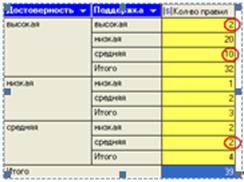Разделим все правила дерева решений по поддержке и достоверности на некоторые классы ("низкая", "средняя", "высокая" и т.д.) согласно специальной экспертной шкале. Конкретная экспертная шкала сильно зависит от количества обучающих примеров и узлов дерева решений и собственно аккумулирует в себе коэффициент доверия. Тогда поступающие заявки на получение кредита, имеющие, как вариант, среднюю и высокую категорию поддержки и достоверности правила скоринг-модели, не будут получать дополнительное подтверждение в кредитном отделе (такие правила обведены в таблице красным).