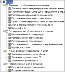 Практически сразу после появления первых данных о выдаваемых кредитах становится доступным проводить анализ на основе OLAP-отчетности. Базовая отчетность включает 4 группы отчетов: