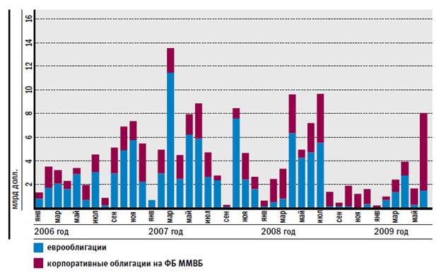 К концу 2009 года объем корпоративных и банковских облигаций достиг 2526,4 млрд. руб. (прирост за год на 39,4%). На внутреннем рынке обращалось 630 выпусков 405 корпоративных эмитентов. При этом по итогам 2008 года объем указанного рынка составлял 1812,3 млрд. руб., торговались 650 выпусков 463 эмитентов. Таким образом, число эмитентов уменьшилось на 12,5 процентов.