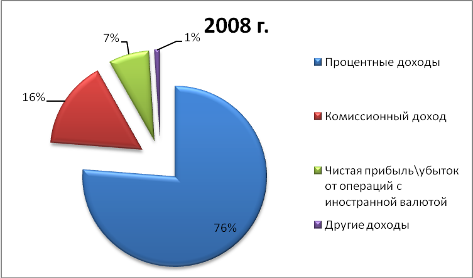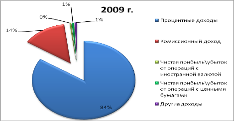 Таким образом, наибольший удельный вес в структуре доходов в 2008г. занимают процентные доходы (76,25%), потом идут комиссионные доходы (15,69%), а после все остальные. В 2009г. также наибольший удельный вес занимали процентные доходы и комиссионные доходы, имея при этом удельный вес соответственно 84,12% и 13,87%. Общий объём доходов сократился на 22,67%.