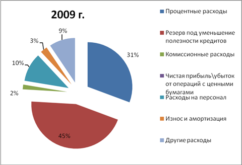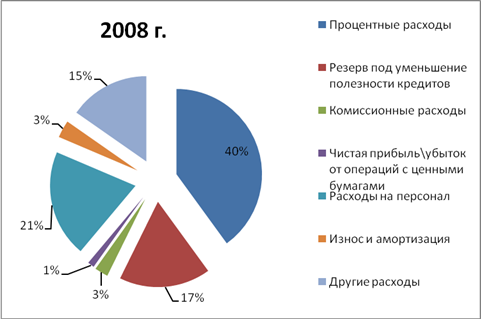 Таким образом, в структуре расходов в 2008г. 39,93% занимают процентные расходы, 20,28% занимают расходы на персонал, 17,27% занимает резерв под уменьшение полезности кредитов, 15,26% и 22,5% занимают все остальные расходы. В 2009г. в структуре расходов преобладает резерв под уменьшение полезности кредитов (45,17%), 30,64% занимают процентные расходы, 10,42 занимают расходы на персонал и 13,78% занимают все остальные расходы. Общий объём расходов увеличился на 18,07%