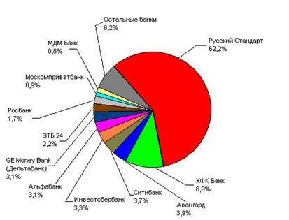 На рынке кредитных карт ЗАО «Банк Русский Стандарт» является лидером. Доля Банка по размеру консолидированного портфеля составляет 62,2% в 2008году. Доля ближайшего конкурента, Home Credit – 8,9% (рис.2).