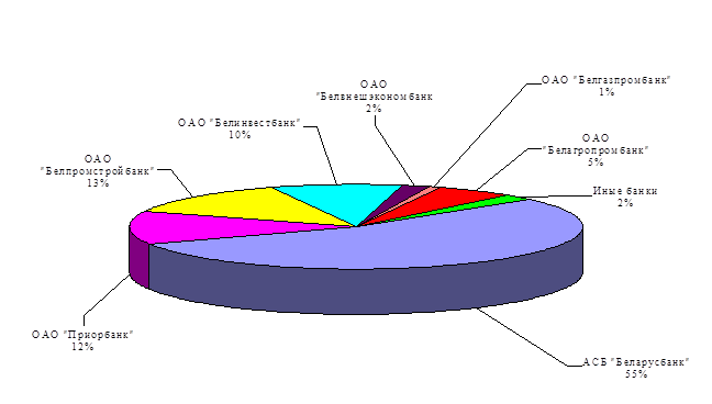 В настоящее время 18 банков Республики Беларусь осуществляют эмиссию банковских пластиковых карточек. По состоянию на 01.07.2008 г. количество карточек с открытием карт-счетов в национальной валюте составило 98,3%, и соответственно 1,7% приходилось на карточки с открытыми счетами в иностранной валюте. Следует отметить, что за первое полугодие 2008 г. эмиссия карточек увеличилась на 39,8 тыс. шт. Большую часть в общем объеме выпущенных карточек на 01.07.2008 г. (54,5 %) обеспечил АСБ «Беларусбанк» - 1895 569 шт. Также существенную нишу на рынке банковских карточек в 2008 г. заняли такие банки как ОАО «Белпромстройбанк» – 449 961 карточек (12,9 % от общего объема эмиссии), ОАО «Приорбанк» – 434 123 карточек (12,5 %), ОАО «Белинвестбанк» – 332 067 карточек (9,5 %), ОАО «Белагропромбанк» - 190 920 карточек (5,5 %). Наглядно доля рынка по количеству выпущенных банковских пластиковых карточек банками республики изображена на рис. 12 по состоянию на 01.07.2008 г.