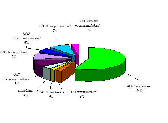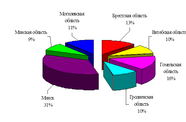В разрезе регионов развитие рынка банковских карточек можно охарактеризовать следующим образом: по эмиссии карточек лидируют г. Минск (31% от общего объема эмиссии) и Гомельская область (16%). Графически эмиссия банковских пластиковых карточек по областям представлена на рис. 3.