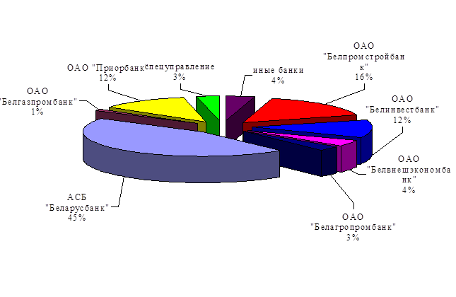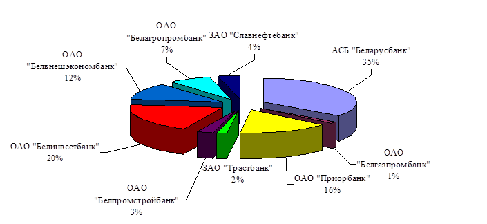 В результате значительных инвестиций со стороны белорусских банков в развитие систем расчетов с использованием банковских карточек и при активной поддержке государства на отечественном рынке начала формироваться современная инфраструктура обслуживания банковских карточек различных систем расчетов, основанная на внедрении платежных терминалов и банкоматов. Так по состоянию на 01.07.2008 г. в 4568 предприятиях торговли и сервиса принимали карточки в уплату за товары и услуги (на 12 % больше, чем на 01.01.2008 г.), в 2094 пунктах выдавали наличные (на 10 % больше, чем на 01.01.2008 г.) и в 1345 банкоматах (на 25 % больше, чем на 01.01.2008 г.) держатель мог снять денежные средства со счета с использованием карточки. Наиболее активную работу по развитию элементов технической инфраструктуры обслуживания держателей карточек в 2008 г. проводил АСБ «Беларусбанк» - количество банкоматов составило по состоянию на 01.07.2008 г. – 600 шт. (45 %) (рис. 4) от общего объема; количество ПТС – 1602 шт. (35 %) (рис. 5), количество ПВН – 1164 шт. (56 %) (рис. 6).;