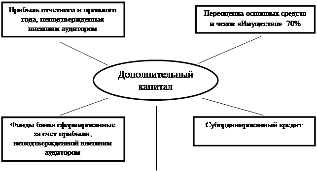 Дополнительный капитал включает: прибыль отчетного года; неподтвержденную нераспределенную прибыль прошлого года; фонды, сформированные за счет прибыли отчетного и прошлого года, неподтвержденной внешней аудиторской организацией; нереализованные курсовые разницы от переоценки иностранной валюты в уставном фонде, эмиссионных разницах и фондах банка, сформированных из прибыли (кроме фонда дивидендов, а также фондов, отнесенных к основному капиталу), оцененные с понижающим процентом в части ограниченно конвертируемой валюты; переоценку основных средств, произведенную в соответствии с постановлениями Совета Министров Республики Беларусь; переоценку именных приватизационных чеков «Имущество» и прочих статей баланса, оцененную с понижающим процентом; привлеченный субординированный кредит (заем, депозит) в сумме, не превышающей 50 процентов величины основного капитала.