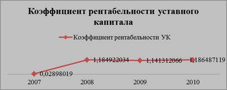 Далее рассмотрим коэффициент рентабельности уставного капитала Банка. Он аналогичен предыдущему показателю с той разницей, что он отражает эффективность использования уставного фонда Банка, и рассчитывается по формуле: