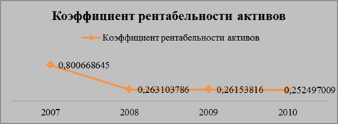 Коэффициент рентабельности активов предприятия также немаловажный показатель. Он позволяет определить эффективность использования активов предприятия. Коэффициент рентабельности активов показывает, сколько денежных единиц чистой прибыли заработала каждая единица активов. Он рассчитывается по формуле:
