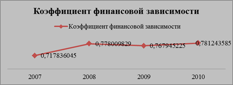 Далее рассчитаем коэффициент финансовой зависимости – это величина, определяющая относительную долю заёмных средств капитала в общей валюте бухгалтерского баланса. Этот показатель является обратным коэффициенту финансовой устойчивости и рассчитывается по формуле: