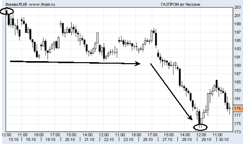 График с часовым периодом за рассмотренный срок сформировался внутри нисходящей волны восходящего тренда, рассмотренного на дневном графике, что объясняет преобладание черных свечек. Откатившись от октябрьского максимума, цена какое-то время находилась в боковом тренде, после чего негативные настроения рынка взяли верх, опустив цену ниже 180 руб. В последние 2 дня тенденции движения цены данной бумаги были противоположными: резкий взлет от точки минимума в четверг и вновь откат на прежние позиции в пятницу.