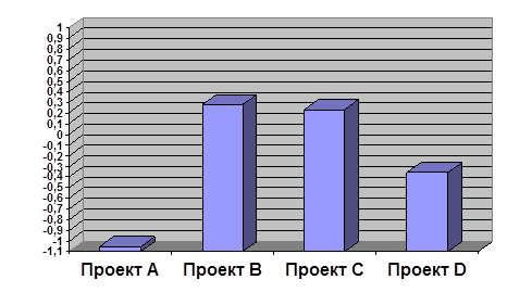 Если оценку делать без учета влияния инфляции, то проекты следует принять, поскольку положительные. Однако если сделать поправку на индекс инфляции, т.е. использовать в расчетах номинальный коэффициент дисконтирования p=15%, то вывод будет иным, поскольку в этом случае NPV (А)= -1,05 ; NPV (В)= 0,28 ; NPV (С)= 0,23 ; NPV (D)= -1,05 . Проекты А и D следует отклонить (рис.2.6).