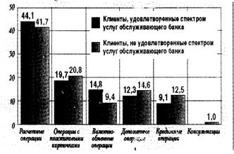 Из данных рисунка 2.2 следует, что по таким услугам как операции с пластиковыми карточками, депозитные операции, кредитные, число неудовлетворенных спектром услуг превышает число удовлетворенных.